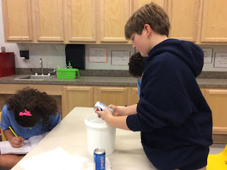 Our 6th graders designed their own experiments in order to determine which was more dense: a can full of Pepsi or a can full of Diet Pepsi. Each team of students was given a can of each soda, and a bucket filled with water. They had to work collaboratively in order to decide their procedures of their experiment on how to answer the question of "Which is more dense Pepsi or Diet Pepsi?". Once they determined which was more dense the students developed hypotheses on the reasons why, which led to a debate on artificial sweeteners and high fructose corn syrup.